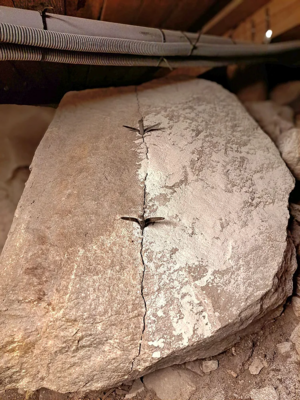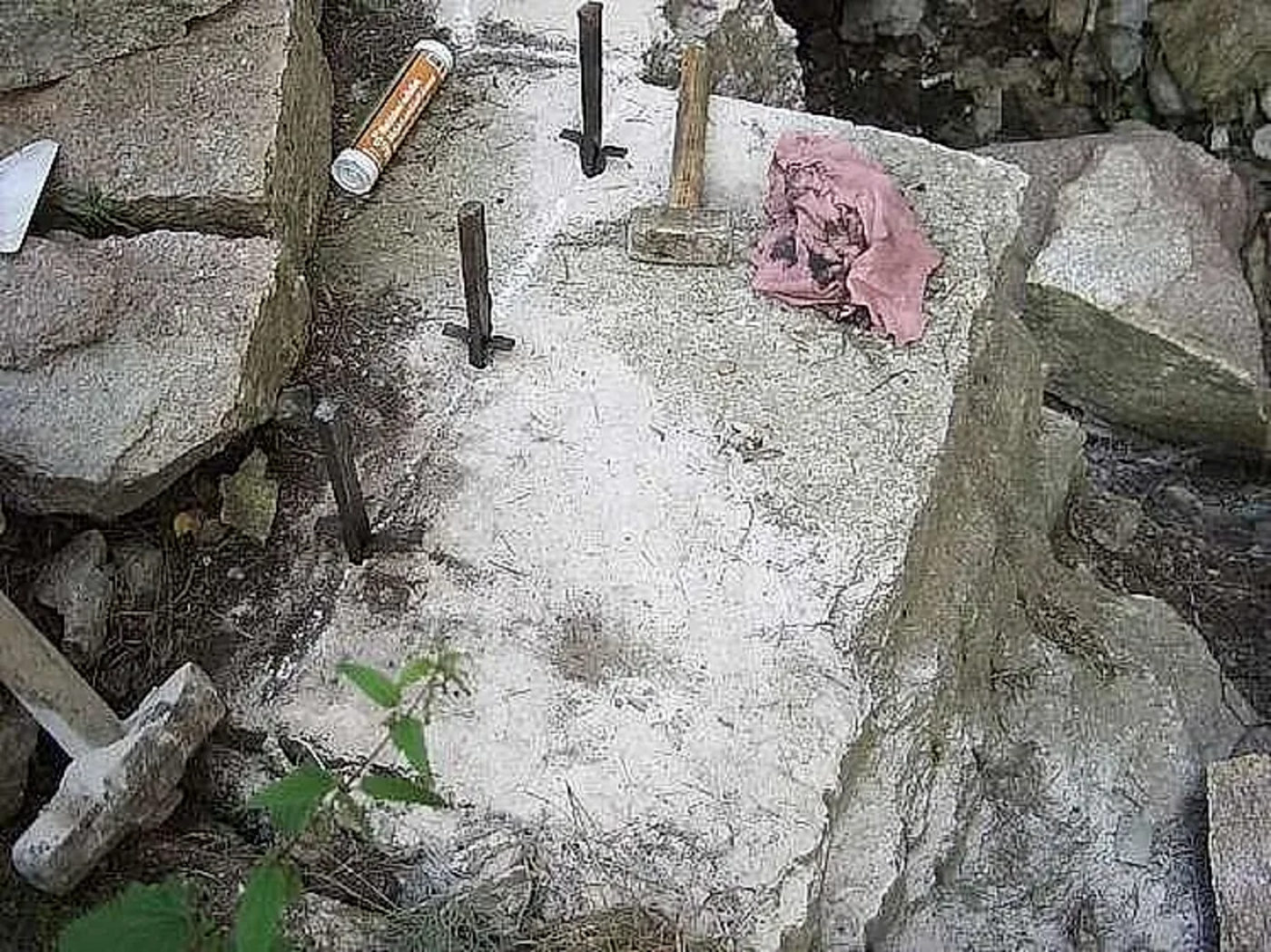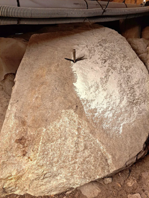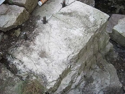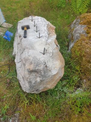 På bildet deles en 3 meter lang stein på langs med 18 stykker 12 mm kilesett. Dette viser hvor effektiv metoden med steinkiler er for store steiner – helt uten kjemisk sprengstoff eller dynamitt.